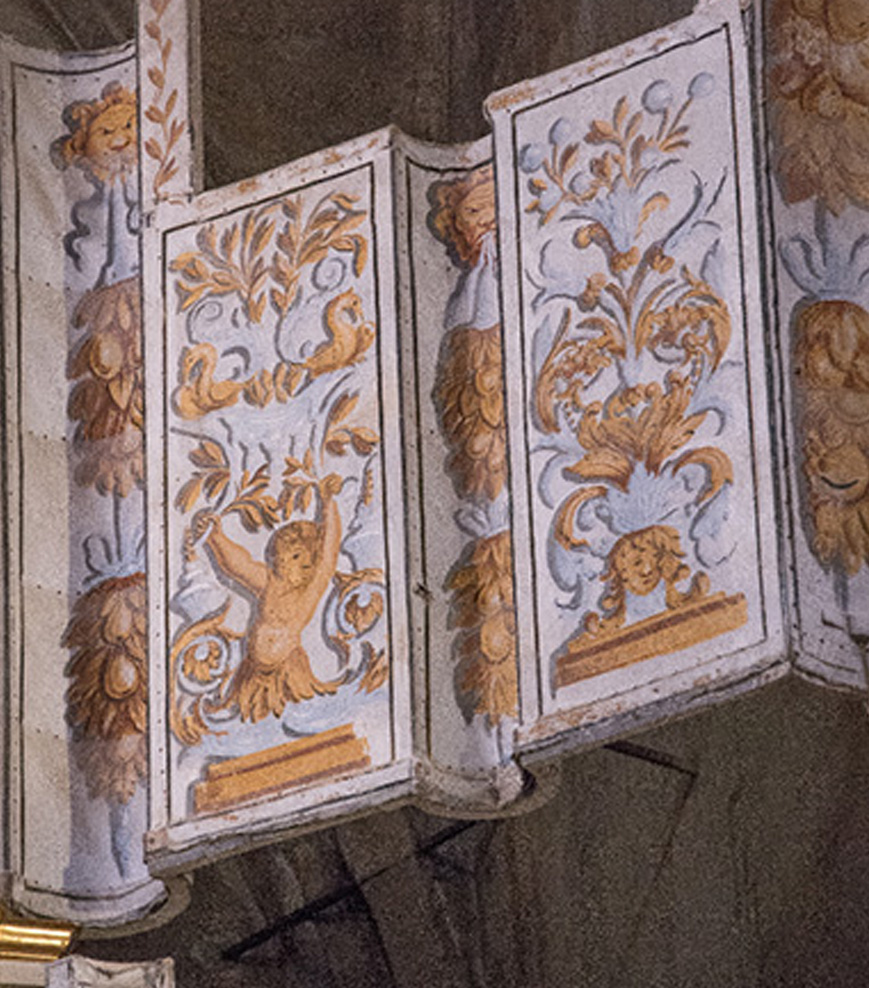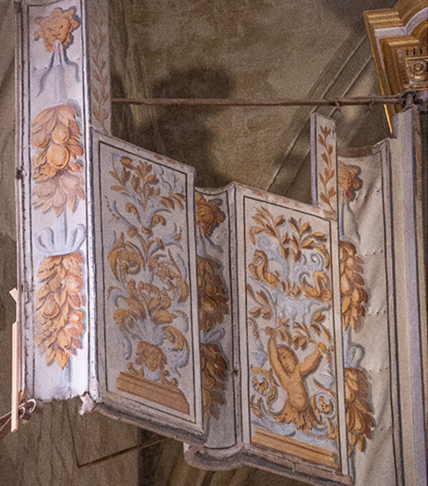 Fait unique en France, le buffet a conservé les teintes d’origine et ses volets sont toujours en place depuis le XVIIème siècle. Ils sont en toiles peintes tendues sur des châssis articulés. Le double buffet est de style Louis XIV mais tendance méridionale, avec des dorures.