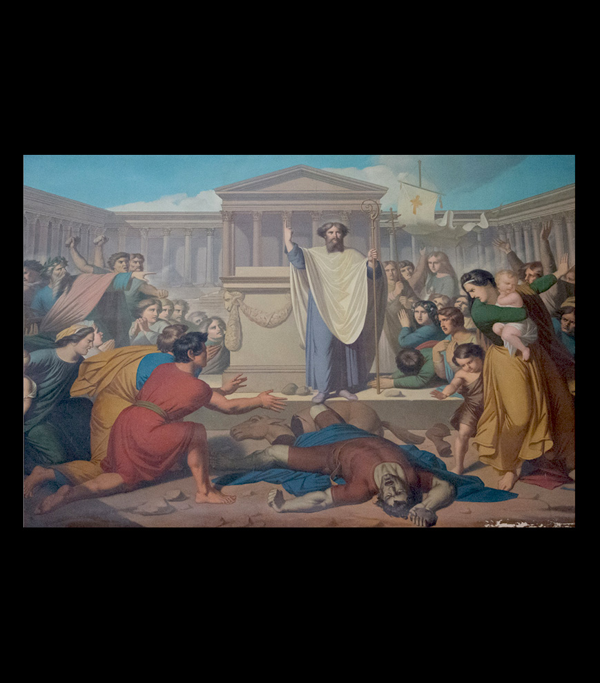 Nous ne connaissons ni le peintre, ni la date de ce tableau qui représente l’un des principaux miracles attribué à St Firmin.
